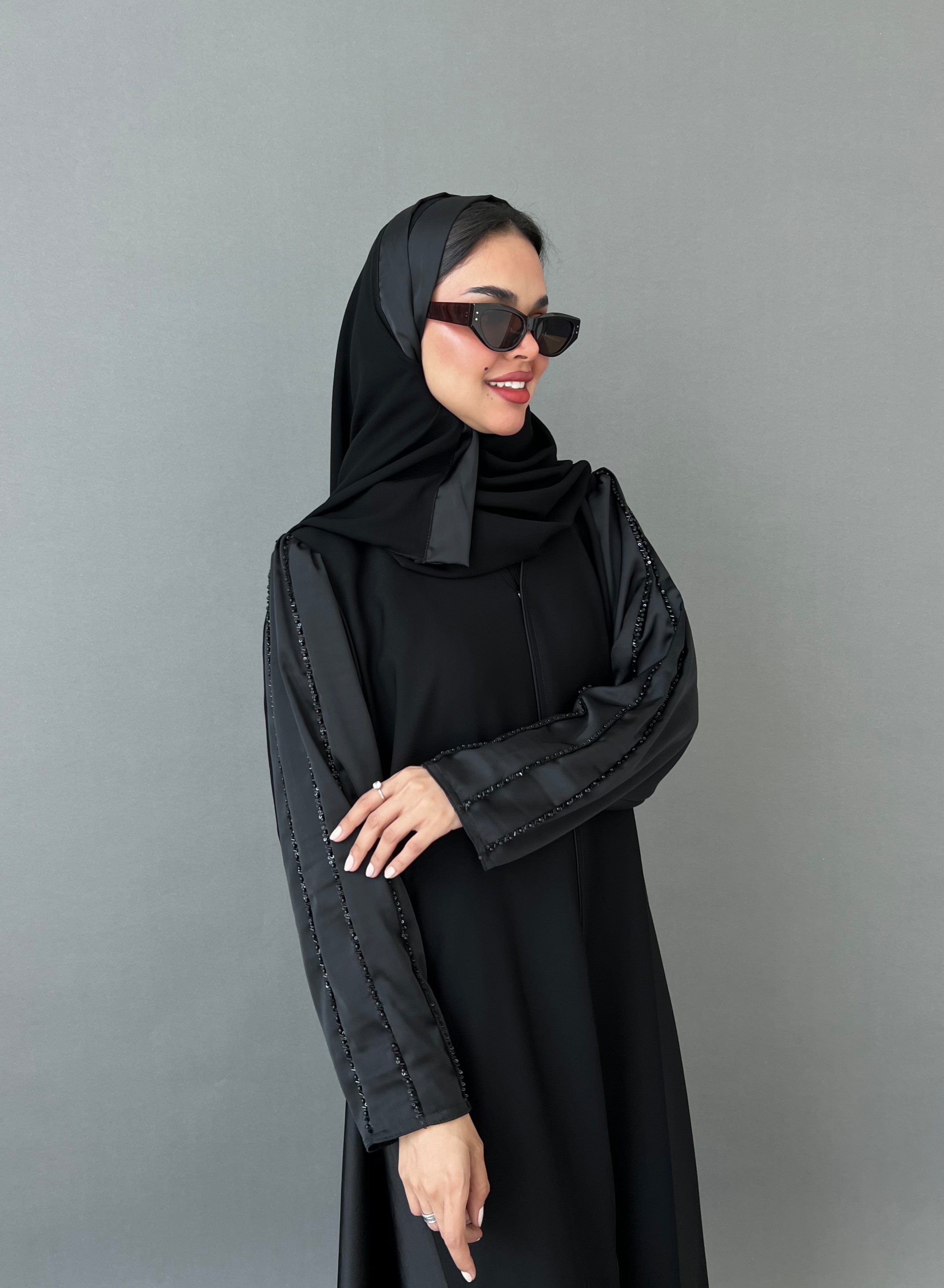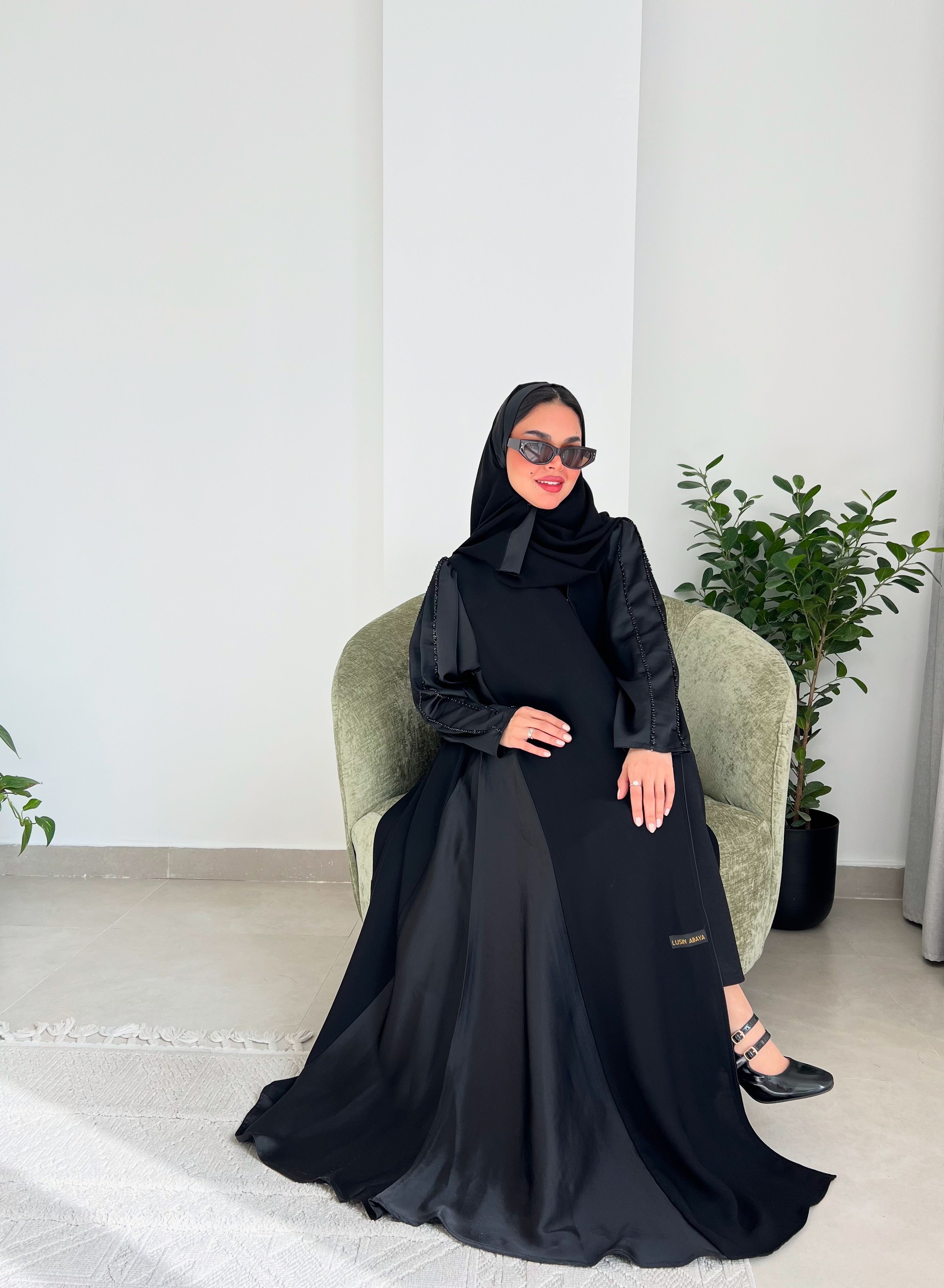إطلالة أنيقة بلون موحّد تعكس الرقي والبساطة. عباية سوداء مصممة بجوانب وأكمام من خامة الكريب الأسود الفاخر، مزينة بشك ناعم على الكتف يضفي لمسة فنية راقية على التصميم. تفاصيل العباية تضفي لمسة أنثوية ناعمة تجعلها مثالية لمظهر يومي أنيق أو لإطلالة راقية في المناسبات. تأتي مع طرحة سوداء متناسقة لإطلالة مكتملة بالأناقة