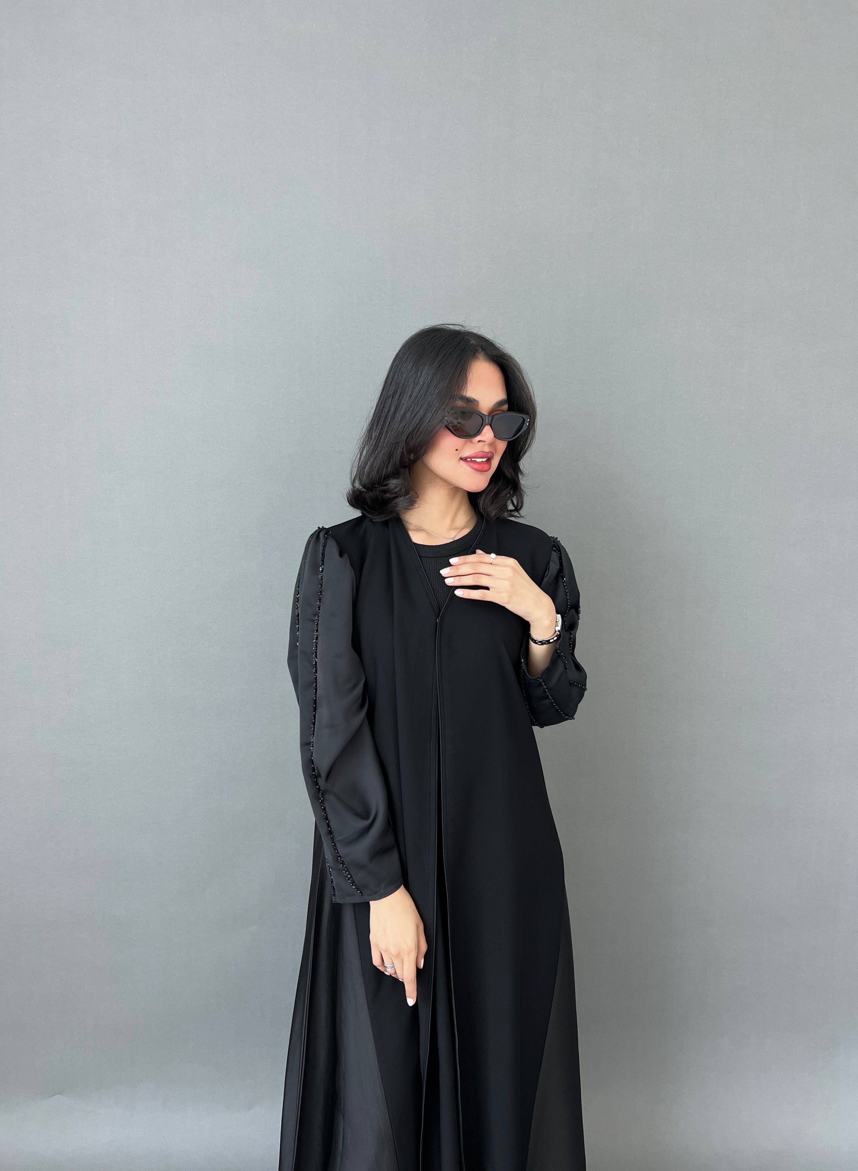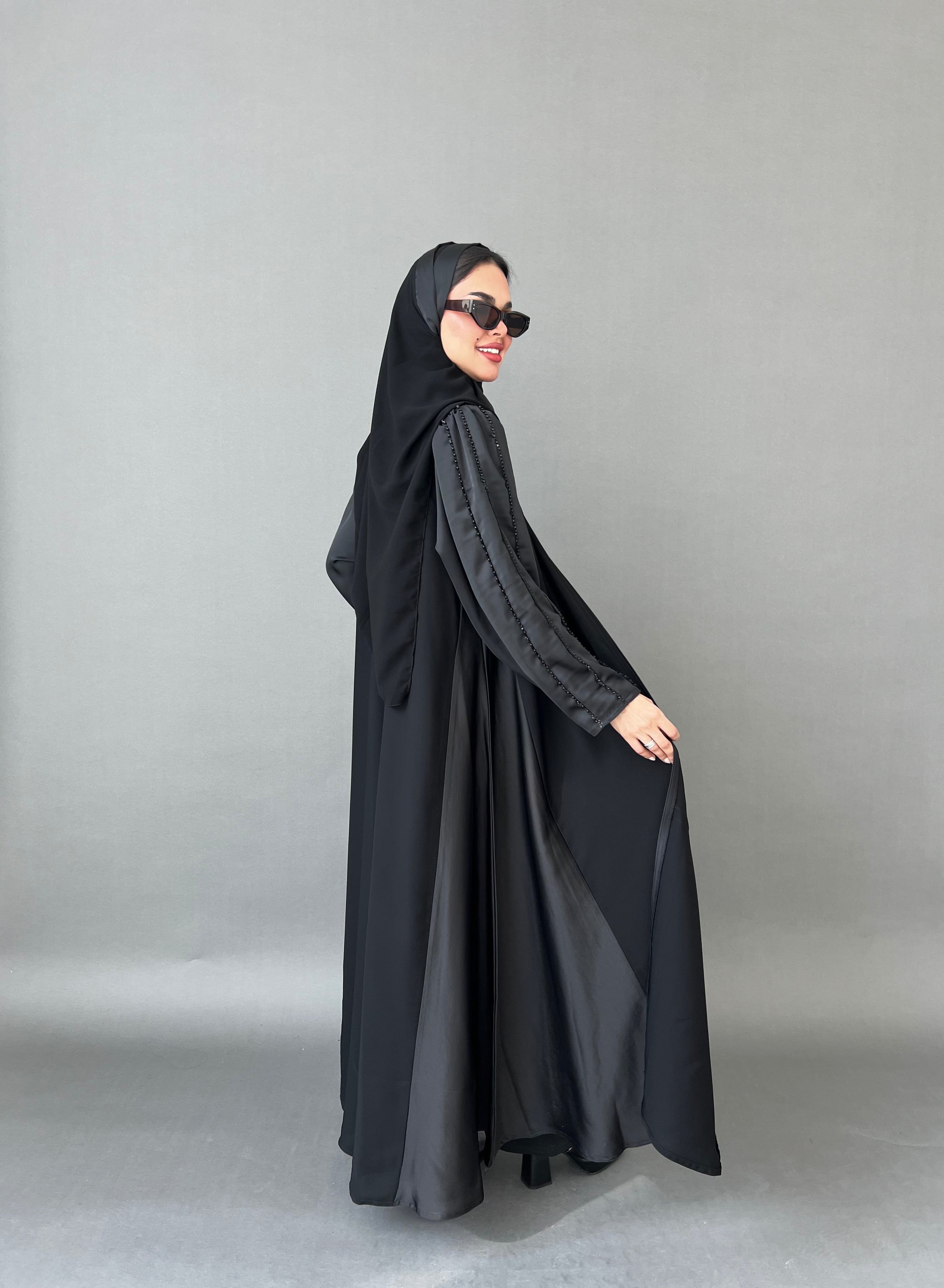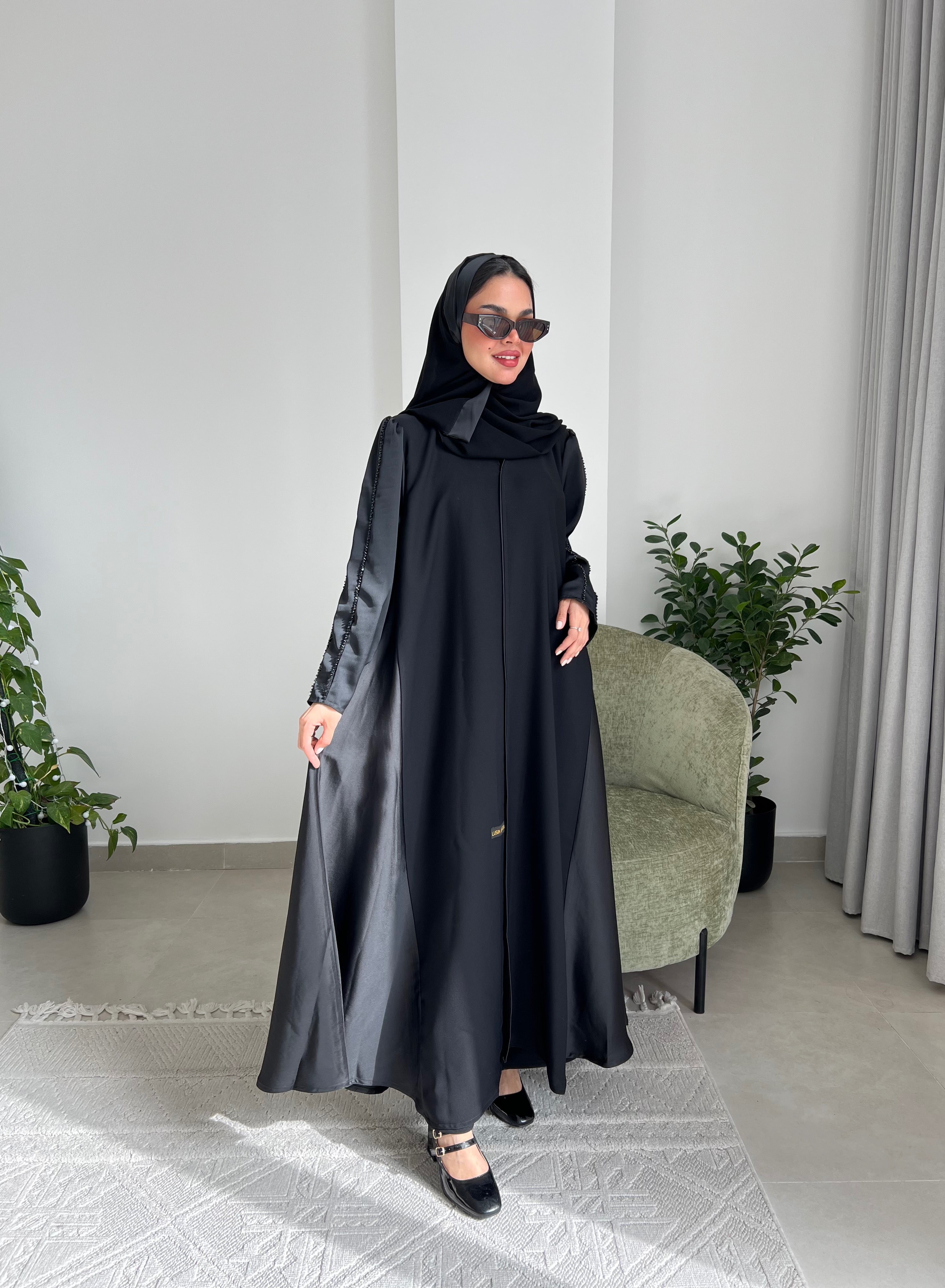 عباية سوداء بجوانب وأكمام كريب أسود مع شك على الكتف