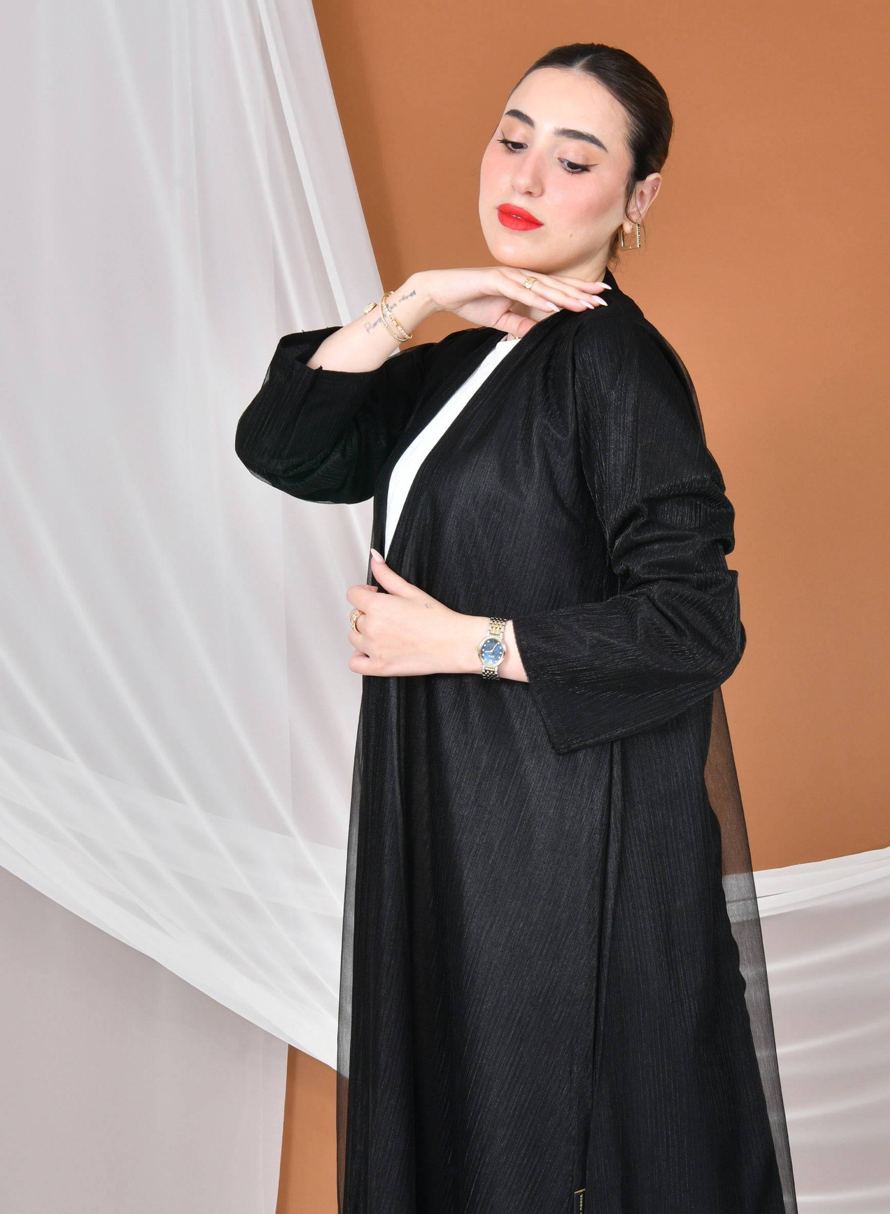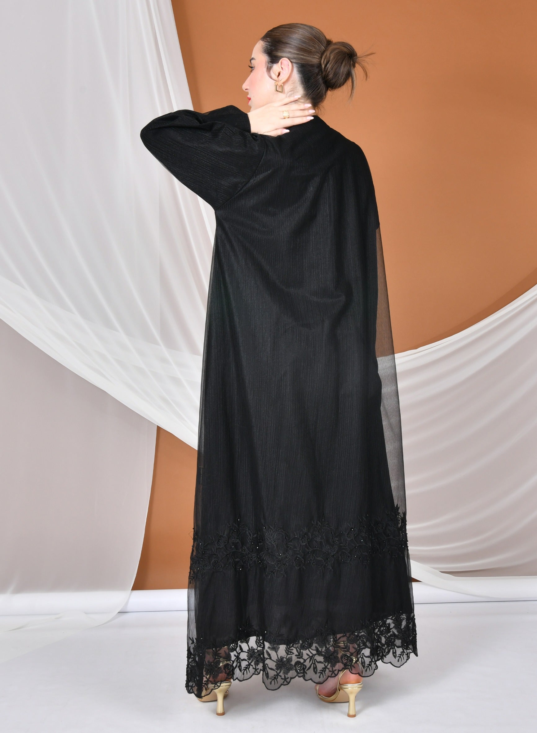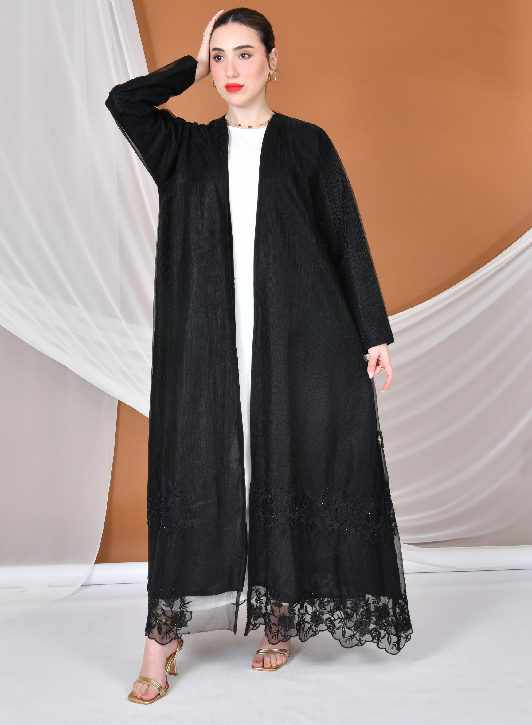 عباية لف سوداء ربع كلوش بقماش الاوقانزا بتطريز انيق وراقي اسفل العباية